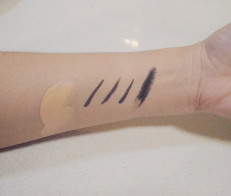 Products from left to right: Benefit’s Hello Flawless! Oxygen Wow Liquid Foundation, The Body Shop’s Liquid Eyeliner and IT Cosmetics’ Superhero Elastic Stretch Volumizing Mascara.